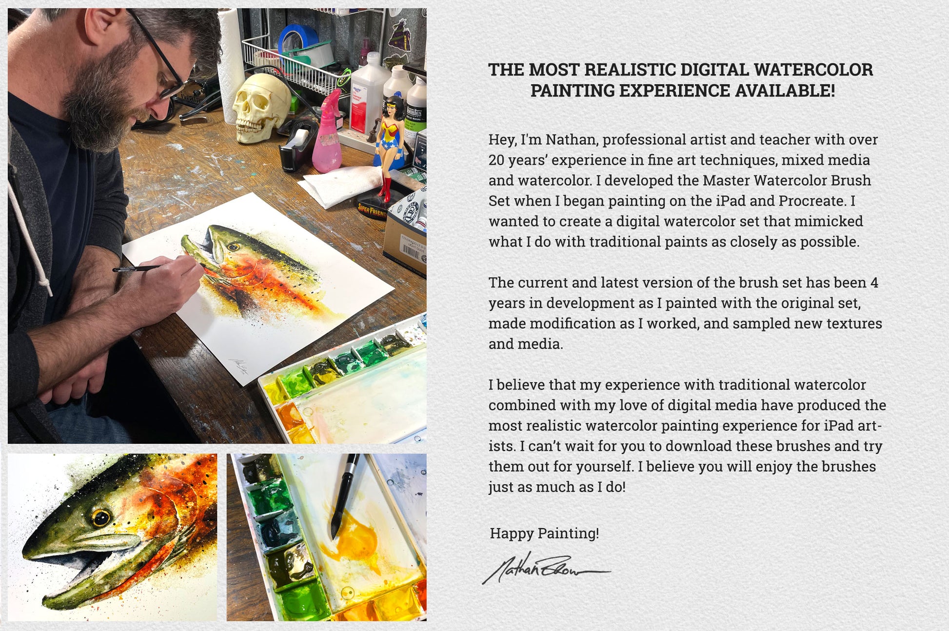 Hey, I’m Nathan, professional artist and teacher with over 20 years’ experience in fine art techniques, mixed media and watercolor. I developed the Master Watercolor Brush Set when I began painting on the iPad and Procreate. I wanted to create a digital watercolor set that mimicked what I do with traditional paints as closely as possible.