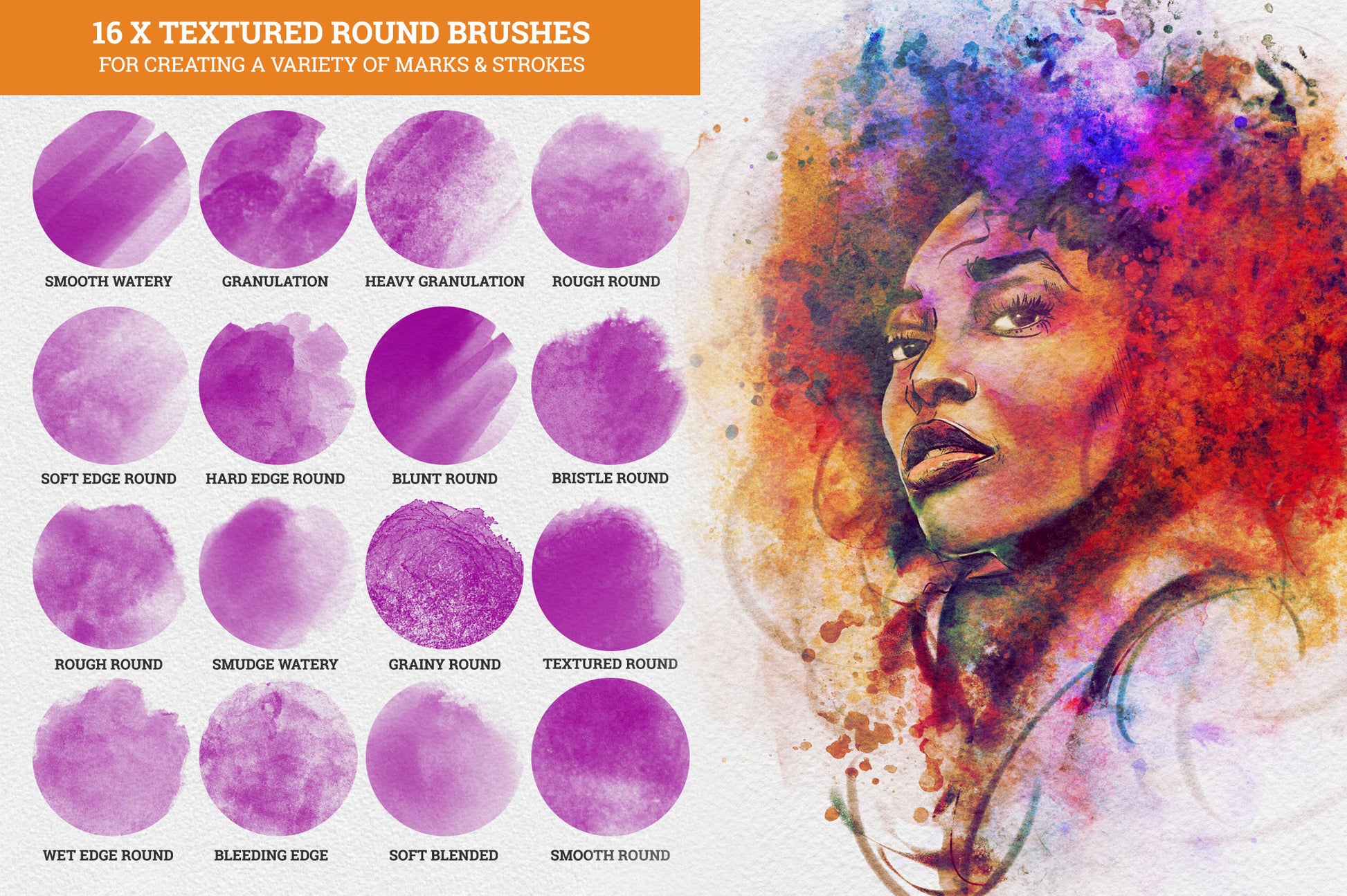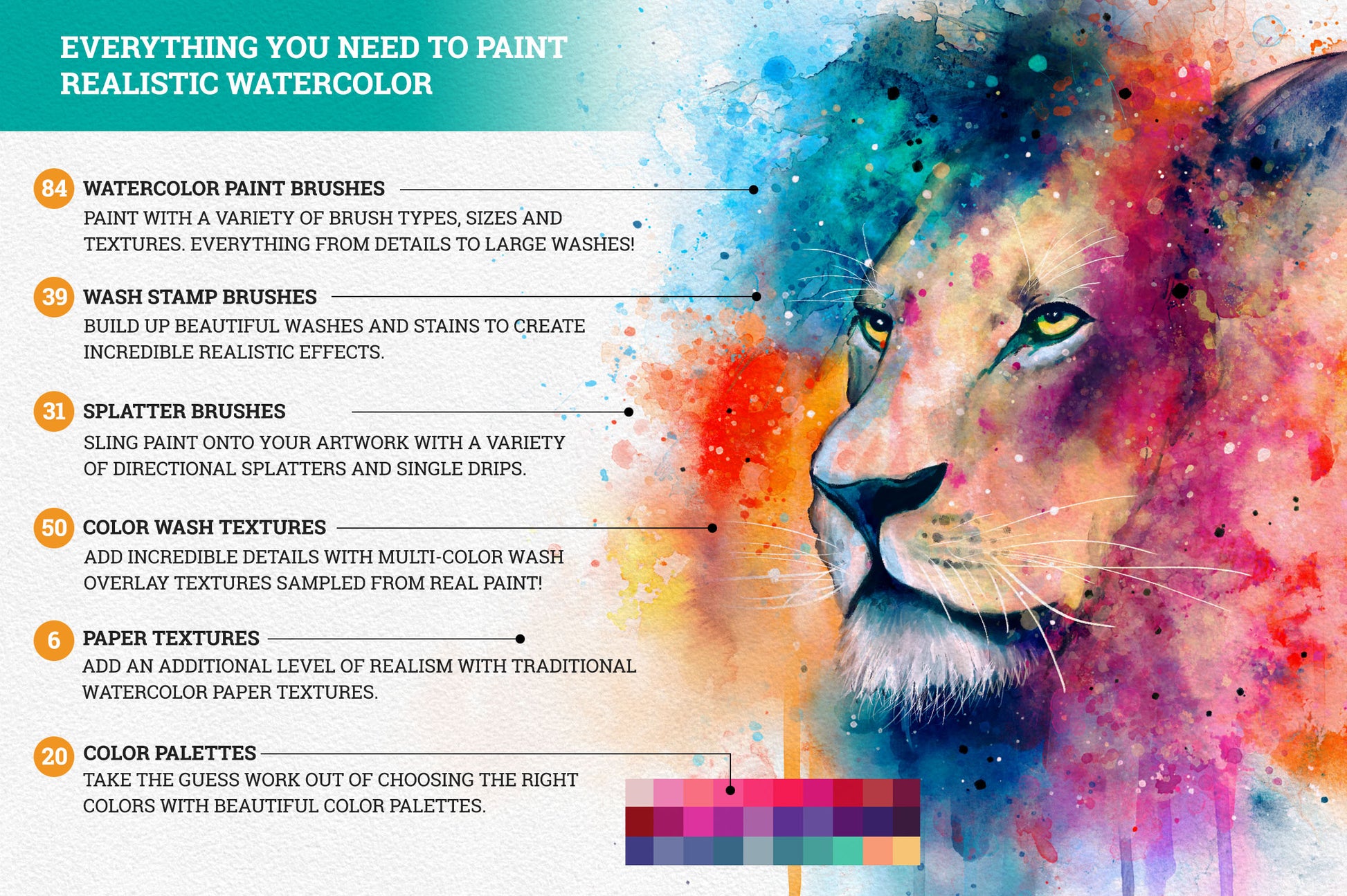 - 84 Watercolor paint brushes for drawing, shading, textures, details and large washes